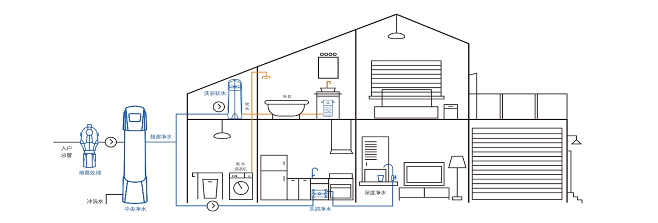 全屋凈水系統(tǒng)是從水源入戶開始,根據家庭不同用水點需求,通過不同凈水產品科學合理搭配,將家庭飲水、廚房用水、洗漱、沐浴及洗衣等生活飲用水進行全方位深度凈化,以全面深度保護家人身體健康及熱水器、洗衣機、浴缸、淋浴器、智能馬桶等家用涉水設備。全屋凈水系統(tǒng)一般由前置處理產品、中央凈水產品、軟水產品、末端凈水產品組成。